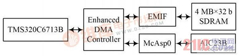 由于系統(tǒng)運(yùn)行過程中需要實(shí)現(xiàn)的算法較多,僅依靠TMS320C6713B 的192 KB片內(nèi)RAM 來執(zhí)行程序是很困難的。本文使用了EMIF 的接口擴(kuò)展了SDRAM 作為算法和數(shù)據(jù)的存儲(chǔ)區(qū)域。采用TLV320AIC23B 實(shí)現(xiàn)音頻輸入和輸出,AIC23 支持48 kHz 帶寬、96 kHz 采樣率的雙聲道立體聲A/ D,D/ A,音頻輸入包括了*輸入和線路輸入。