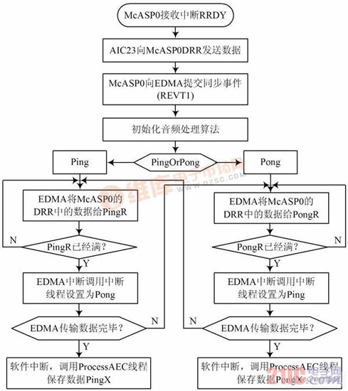 基于DSP 的實(shí)時(shí)處理的實(shí)現(xiàn),本文將AIC23 采集到的數(shù)據(jù)先存儲(chǔ)到SDRAM 中,在需要處理的時(shí)候利用EDMA 實(shí)現(xiàn)Ping Pong 緩沖,將待處理的數(shù)據(jù)分批搬運(yùn)到片內(nèi)存儲(chǔ)器,結(jié)合高速緩存和片內(nèi)內(nèi)存設(shè)計(jì)合適的數(shù)據(jù)結(jié)構(gòu),并將數(shù)據(jù)對齊,這樣大大減小了數(shù)據(jù)搬移帶來的開銷。