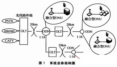 系統(tǒng)的總體結(jié)構(gòu)如圖1所示。它與傳統(tǒng)的EPON系統(tǒng)的主要區(qū)別在于本系統(tǒng)在普通ONU中融合了Wi—Fi無(wú)線(xiàn)組網(wǎng)方式,同時(shí)為終端用戶(hù)提供有線(xiàn)和無(wú)線(xiàn)兩種方式的服務(wù)。這里將本系統(tǒng)命名為融合型ONU。