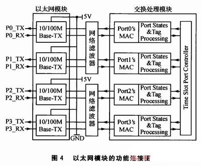 以太網(wǎng)模塊的功能連接圖如圖4所示,進(jìn)出以太網(wǎng)接口的信號(hào)都需要經(jīng)過(guò)網(wǎng)絡(luò)濾波器,網(wǎng)絡(luò)濾波器實(shí)質(zhì)上是一個(gè)選頻電路,它的功能就是允許某一部分頻率的信號(hào)順利的通過(guò),而另外一部分頻率的信號(hào)則受到較大的抑制。與網(wǎng)絡(luò)濾波器相連的是交換處理模塊中的Port's MAC(M-edia Access Controllers),用來(lái)解決在共用信道中產(chǎn)生競(jìng)爭(zhēng)時(shí)分配信道的使用權(quán)問(wèn)題。