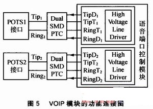 VOIP模塊的功能連接圖如圖5所示。Dual SMD PTC叫做雙重?zé)崦綦娮瑁蓪?duì)過(guò)熱和過(guò)流雙重作用導(dǎo)致的電路故障進(jìn)行保護(hù);Tip and Ring(正極線(xiàn)和負(fù)極線(xiàn))表示組成電話(huà)配線(xiàn)電路的兩條電線(xiàn),Tip是正極線(xiàn)的別稱(chēng),Ring是負(fù)極電線(xiàn)的別稱(chēng)。