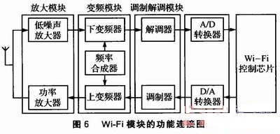 Wi—Fi模塊的功能連接圖如圖6所示。本系統(tǒng)的天線(xiàn)是外置天線(xiàn),這樣能盡量穩(wěn)定信號(hào)。天線(xiàn)與RF射頻模塊相連,RF射頻模塊大致可分為放大模塊、變頻模塊、調(diào)制解調(diào)模塊等有源部件,然后通過(guò)A/D、D/A轉(zhuǎn)換與Wi—Fi控制芯片相連。Wi—Fi控制芯片控制整個(gè)無(wú)線(xiàn)模塊的運(yùn)行。