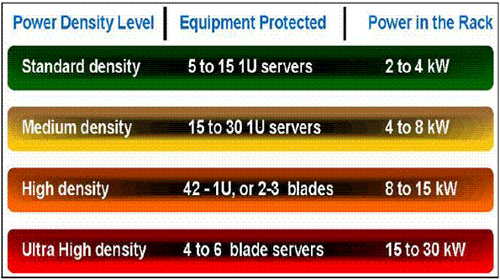 當(dāng)企業(yè)部署刀片式服務(wù)器來宿主其虛擬服務(wù)器時(shí)尤其如此。刀片式服務(wù)器采用多個(gè)即插即用型處理裝置,它們共享公共的電氣系統(tǒng)、電源、風(fēng)扇、電纜和存儲(chǔ)器。這樣的安排節(jié)省了數(shù)據(jù)中心的占地面積,簡化了硬件管理,并提高了IT靈活性。然而,這同時(shí)也大大增加了運(yùn)算密度。結(jié)果,刀片式服務(wù)器產(chǎn)生大量的熱,從根本提高了機(jī)柜級供電要求。確實(shí),一個(gè)典型的傳統(tǒng)服務(wù)器機(jī)柜可能需要4至6 kW電力,而一個(gè)典型的布滿刀片式機(jī)架的機(jī)柜則可能需要高達(dá)30 kW的電力,遠(yuǎn)遠(yuǎn)超過許多電源和冷卻系統(tǒng)的處理能力。