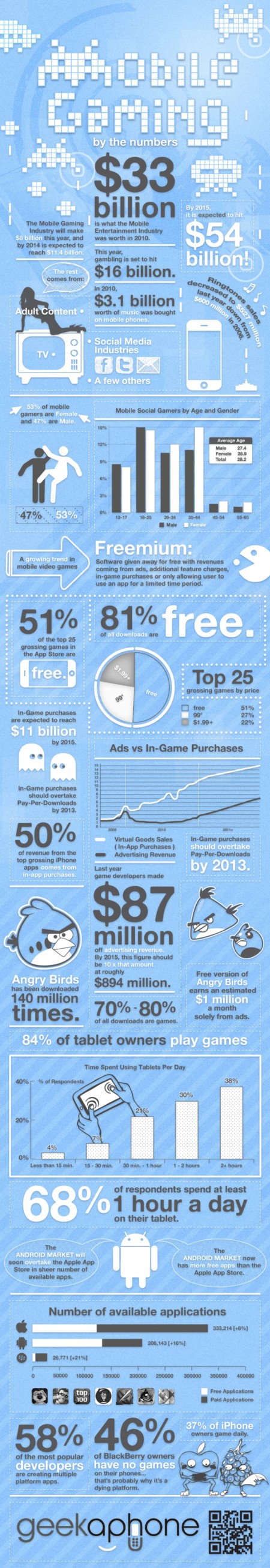 隨著移動互聯(lián)網(wǎng)浪潮的興起,大家玩游戲的平臺逐漸從傳統(tǒng)的游戲機,PC,TV向新興的智能手機和平板電腦等移動終端遷移。PC時代的游戲巨頭EA,育碧等公司的光芒不再,PopCap,Rovio和Zynga等新興游戲公司出品的游戲則吸引著越來越多的玩家。照目前強勁的發(fā)展趨勢來看,移動游戲在未來將取得像PC游戲現(xiàn)在的地位,成為游戲市場的主力。關注移動終端發(fā)展的博客Geekaphone制作了下面這張超大信息圖,用詳細的統(tǒng)計數(shù)字展示了移動游戲發(fā)展的強勁趨勢。
