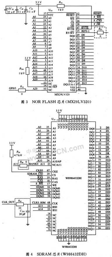 系統(tǒng)存儲模塊包括1塊NOR FLASH芯片MX29LV320和2塊SDRAM芯片W986432DH。MX29LV320的引腳分布如圖3所示。