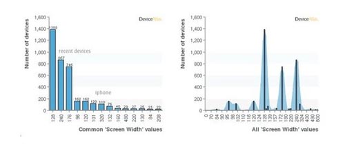 還有一點(diǎn),不到5%的設(shè)備寬度大于320個(gè)像素。但這一數(shù)字可能會(huì)在未來有所提升,目前已經(jīng)可以看到,小屏幕(128,176等)設(shè)備正逐漸被大屏幕(240+)設(shè)備所代替。下面的圖表給出了相關(guān)的分析。