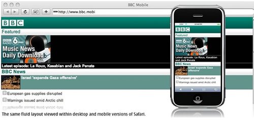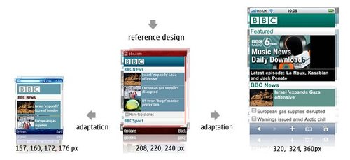 BBC還可以為特定的設(shè)備(或是一組設(shè)備)重新編排一些內(nèi)容。iPhone有非常豐富的功能,因此iPhone版的BBC還有音樂下載選項(xiàng),而其他的設(shè)備可能只會(huì)顯示今天最熱門的‘BBC新聞’?梢愿鶕(jù)數(shù)據(jù)的大小,多媒體的處理能力甚至是屏幕的尺寸決定是否需要針對(duì)iPhone提供更加豐富的內(nèi)容。以Nokia 6680上的‘特色’顯示為例,它大部分的顯示內(nèi)容是讓用戶滾動(dòng)屏幕查看今天最熱門新聞故事。iPhone上顯示了三個(gè)新聞故事,而其中只有一篇配有插入。這使得用戶無需滾動(dòng)屏幕就可以大致了解全部的咨詢。