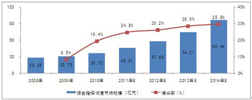 受市場的推動(dòng),未來幾年我國綜合指揮調(diào)度系統(tǒng)建設(shè)的范圍將逐步擴(kuò)大。2011到2014年,我國綜合指揮調(diào)度市場的復(fù)合增長率將達(dá)到28.16%,2014年市場規(guī)模將達(dá)到96.44億元。