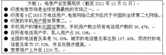 印度電信產(chǎn)業(yè)去年繼續(xù)保持高速增長。截至2011年12月,印度共有9億2655萬電話用戶,即將突破10億大關(guān),其中手機(jī)用戶8億9386萬。印度的電信網(wǎng)絡(luò)已成為僅次于中國的全球第二大電信網(wǎng)絡(luò)。因特網(wǎng)和寬帶的普及率也在提高,現(xiàn)在共有2099萬因特網(wǎng)用戶,1330萬為寬帶用戶。而且運營商已經(jīng)開始建設(shè)無線寬帶網(wǎng)絡(luò),很快將在全國普及,印度電信市場的發(fā)展前景非常樂觀。電信產(chǎn)業(yè)發(fā)展現(xiàn)狀詳見方框1: