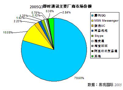 在現(xiàn)階段的中國即時通訊市場,三大廠商優(yōu)勢明顯。騰訊 QQ 以其最早進入即時通訊市場、商業(yè)模式創(chuàng)新成功、用戶群龐大等各種因素所帶來的優(yōu)勢仍舊延續(xù)著對即時通訊市場的幾乎壟斷式的占有,市場份額高達79.6%。緊隨其后的