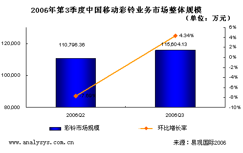研究表明,2006年第3季度,CRBT業(yè)務略有反彈。其中移動彩鈴業(yè)務的分帳前信息費接近16000萬元,較上個季度小幅度反彈2.6%。但是總體上仍然呈現徘徊態(tài)勢,并沒有走出低級飽和區(qū)。