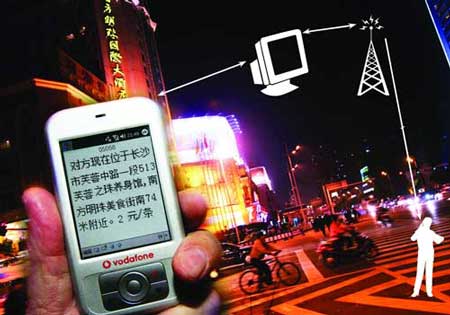 (發(fā)條短信即可鎖定手機(jī)用戶行蹤示意圖。)