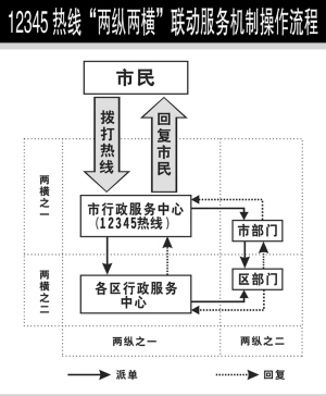 為了保證熱線順利開通提供優(yōu)質(zhì)服務(wù),有關(guān)方面還建立了“兩縱兩橫”聯(lián)動(dòng)服務(wù)機(jī)制。“兩縱”即市行政服務(wù)中心與各區(qū)行政服務(wù)中心之間的縱向聯(lián)系,市級熱線成員單位與區(qū)級熱線成員單位之間的縱向聯(lián)系;“兩橫”即市行政服務(wù)中心與市級熱線成員單位的橫向聯(lián)系,各區(qū)行政服務(wù)中心與區(qū)級熱線成員單位之間的橫向聯(lián)系。