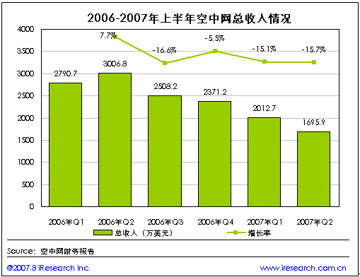 空中網(wǎng)2007年第二季度財報數(shù)據(jù)顯示,第二季度空中網(wǎng)的總收入1695.9萬美元,同比負增長43.6%,環(huán)比負增長15.7%。與第一季度相比在空中網(wǎng)兩個產(chǎn)品平臺的主要2G業(yè)務和2.5G的業(yè)務收入都出現(xiàn)了不同程度的下降,但2G業(yè)務中的IVR業(yè)務收入則出現(xiàn)了大幅上升。