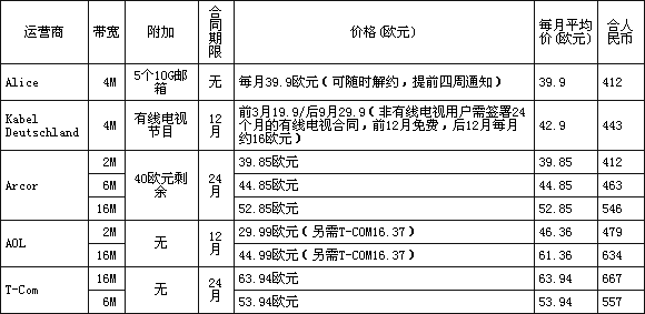 在純上網服務方面,德國Alice公司的4Mbps寬帶最為廉價,包月30歐元,德國人一般月工資大約是1500~2500歐元,上網費占低于純收入的2%。