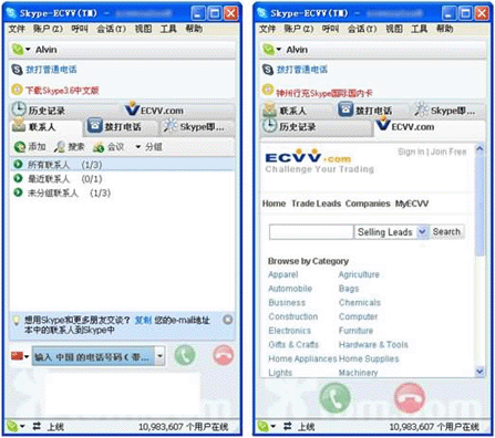 近日,許多貿(mào)易人士在登陸全球貿(mào)易推廣服務(wù)商ECVV的網(wǎng)站時,發(fā)現(xiàn)新增了一項方便貿(mào)易人士在線交流的服務(wù),即“Skype-ECVV貿(mào)易版”。