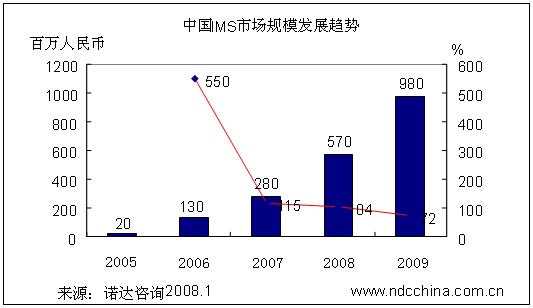 諾達咨詢認為,隨著中國3G市場的啟動,IMS市場也將呈高速發(fā)展的態(tài)勢。到2009年,國內(nèi)IMS市場的總規(guī)模將達到9.8億元(僅指IMS體系的業(yè)務(wù)層和控制層)?傮w而言,電信運營商在IMS業(yè)務(wù)層和控制層上的投資在電信總體投資的比例將長期處于一個比較低的水平,主要用于與現(xiàn)存網(wǎng)絡(luò)互聯(lián)互通的網(wǎng)關(guān)設(shè)備的投資。隨著R5開始部署,有線與無線業(yè)務(wù)的融合進入實質(zhì)階段,并將在2009年以后呈現(xiàn)超高速增長的態(tài)勢。