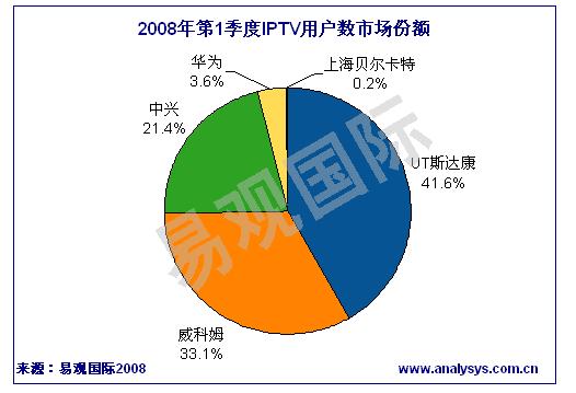 《2008年第1季度中國IPTV市場季度監(jiān)測》數(shù)據(jù)顯示,2008年第1季度中國IPTV累計用戶數(shù)達131萬人。根據(jù)各廠商中標(biāo)業(yè)務(wù)區(qū)實際發(fā)展的用戶數(shù)排名,UT斯達康、威科姆、中興通訊位居前三。2008年第1季度IPTV廠商的競爭格局沒有顯著變化。