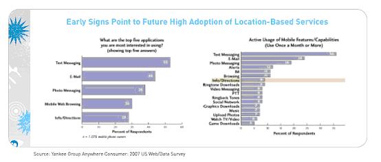當美國聯(lián)邦通信委員會(FCC)在2001年強制要求實施911增強功能時,移動行業(yè)就開始通過將導航服務引入大眾市場來獲利。7年后,絕大多數手機都集成了GPS功能,幾大主要的移動運營商也都計劃在年內推出至少一項基于GPS 的導航應用。揚基集團認為,2008年正在成為美位置服務的轉折點。