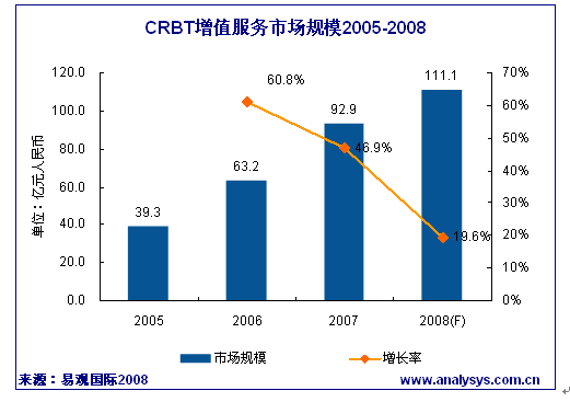 CRBT市場(chǎng)在2007年取得了46.9%的年度增長(zhǎng),預(yù)計(jì)2008年CRBT業(yè)務(wù)的發(fā)展速度將進(jìn)一步放緩,但是運(yùn)營(yíng)商的一些舉措如設(shè)置彩鈴的使用時(shí)限、增加按鍵復(fù)制功能等,將有助提高用戶(hù)ARPU值。