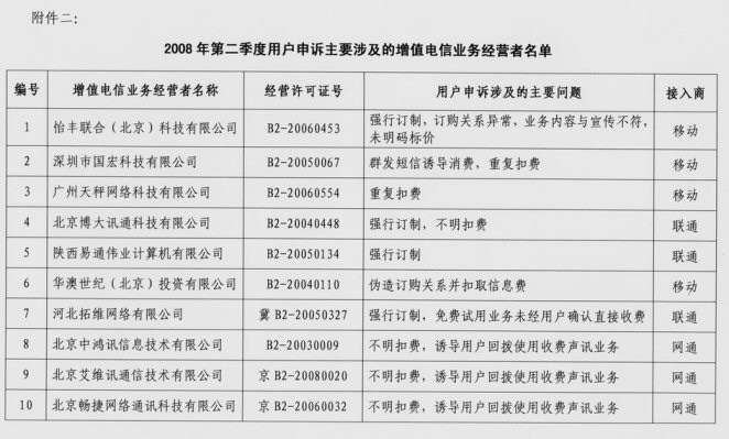 2.2008年二季度用戶申訴主要涉及的增值電信業(yè)務(wù)經(jīng)營(yíng)者名單