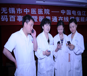 5月25日,江蘇省無錫市中醫(yī)醫(yī)院18位專家級(jí)醫(yī)師接受了中國(guó)電信江蘇公司的聘請(qǐng),成為無錫首批電話在線的健康顧問。全省電信用戶只要撥打號(hào)碼百事通118114,即可得到在線醫(yī)療、健康專業(yè)指導(dǎo)。118114健康平臺(tái)還能為出院病人提供康復(fù)指導(dǎo)、動(dòng)態(tài)跟蹤、復(fù)診提醒等健康管理服務(wù)。通過這一形式,能盡快實(shí)現(xiàn)一個(gè)醫(yī)前、醫(yī)中、醫(yī)后服務(wù)鏈。圖為無錫市中醫(yī)醫(yī)院的健康顧問們?cè)跒榛颊呒w電話會(huì)診。