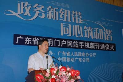 2009年8月7日,廣東省政府在廣州舉行省政府門(mén)戶(hù)網(wǎng)站手機(jī)版開(kāi)通儀式。省政府秘書(shū)長(zhǎng)徐尚武、中國(guó)移動(dòng)廣東公司總經(jīng)理徐龍?jiān)陂_(kāi)通儀式上致辭。