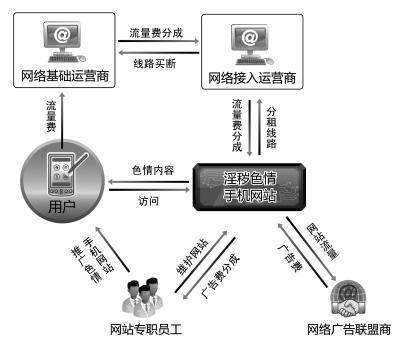 以包裝成彩鈴的標價2塊錢的淫穢色情視頻為例,用戶下載后,電信運營商就會從上網(wǎng)的手機賬號上扣掉2元錢,之后電信運營商就會按照與增值服務商的分成協(xié)議規(guī)定,按一定比例與增值服務商進行分成,比如按3:7進行分成,電信運營商就會將2元錢中的0.6元留為已有,將剩余的1.2元交給增值服務商,增值服務商再將1.2元中的一部分按比例分給內容提供商。在這個過程中,電信運營商不僅獲得了增值服務分成的錢,而且由于提供了上網(wǎng)服務,還會從手機用戶那里收取下載彩鈴所需要的數(shù)據(jù)流量費。