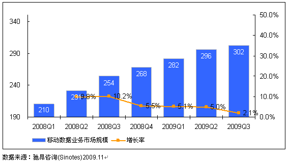 馳昂咨詢(Sinotes)發(fā)布的《2009年中國移動數(shù)據(jù)業(yè)務(wù)市場監(jiān)測-第三季度》報告數(shù)據(jù)顯示,2009年Q3中國移動數(shù)據(jù)業(yè)務(wù)市場規(guī)模達(dá)302億元,相比2009年Q2增長2.1%,表現(xiàn)出了平穩(wěn)增長的態(tài)勢。