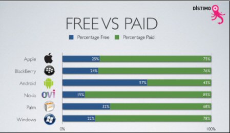 業(yè)內(nèi)人士認為,之所以出現(xiàn)這種情況,或許是因為谷歌最早只面向免費應用開放Android應用商店,后來才允許開發(fā)人員推出付費應用。蘋果和黑莓的免費應用比例比較接近,分別為25%和24%。此外,Palm的這一比例為32%,Windows Mobile為22%,諾基亞Ovi為15%。