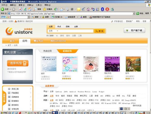 圖:聯(lián)通Unistore手機(jī)應(yīng)用商城測試頁面