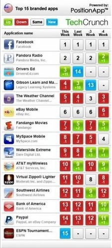 PositionApp提供的數(shù)據(jù)顯示,F(xiàn)acebook長期位居App Store應(yīng)用商店最流行應(yīng)用的榜首。排名第二的是流媒體音樂網(wǎng)站Pandora的應(yīng)用Pandora Radio,該款應(yīng)用在四周前從第三位上升至第二位,目前占據(jù)第二的位置已有四周時間。在PositionApp提供的排名中,包括了許多來自大公司的應(yīng)用。如eBay、社交網(wǎng)站MySpace、美洲銀行、貝寶(PayPal)都位居前列。
