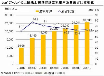 據(jù)中國(guó)互聯(lián)網(wǎng)絡(luò)信息中心(CNNIC)調(diào)查,至2010年6月,中國(guó)在線(xiàn)視頻用戶(hù)已達(dá)2.5億,所占比重是4.2億網(wǎng)絡(luò)用戶(hù)的63.2%;據(jù)易觀(guān)國(guó)際統(tǒng)計(jì),2009年中國(guó)在.線(xiàn)視頻市場(chǎng)規(guī)模達(dá)人民幣8.44億元,較2008年成長(zhǎng)95.4%,其在使用人口及市場(chǎng)規(guī)模表現(xiàn),成為各方爭(zhēng)奪之地。