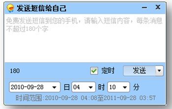 迷你飛信1.0 beta版另一大亮點(diǎn)就是類(lèi)似于“移動(dòng)小秘書(shū)”的自我短信定時(shí)發(fā)送功能。用戶(hù)只需直接在好友列表或使用快捷鍵“Ctrl+Alt+W”,就打開(kāi)了給自己發(fā)送定時(shí)短信的窗口。這一功能將滿(mǎn)足用戶(hù)通過(guò)飛信進(jìn)行“短信提醒”的使用需求。