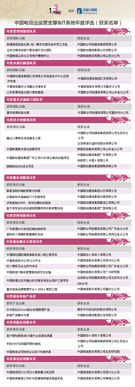 由中國計費網(www.billingchina.com)主辦的“Awards2010”第四屆中國電信業(yè)運營支撐&IT系統(tǒng)年度評選活動的結果于2011年元月31日隆重揭曉。自2010年12月1日評選活動正式啟動以來,歷時兩個月,來自國內運營商集團、省級公司、IT產品與服務提供商的42家企業(yè)的優(yōu)秀產品、項目和團隊共計70份參評項目入圍評選。經過全面征集、選拔、初審以及評委團的嚴格評審,評選結果已經公示。在30位來自運營商IT支撐、業(yè)務和服務部門的威權評委們的認真評審后,共有27家企業(yè)分別獲得了30個Awards2010的團隊/項目/產品/應用服務的榮譽桂冠。