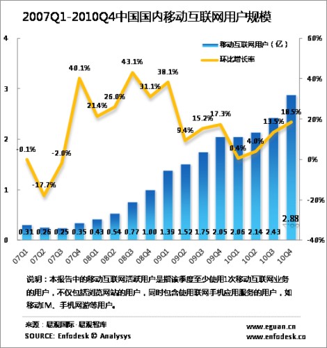 據Enfodesk易觀智庫最新發(fā)布的數據顯示,2010年第4季度中國國內移動互聯網用戶規(guī)模達2.88億人,環(huán)比增長18.52%,相比去年同期呈現41.48%的增長速度。