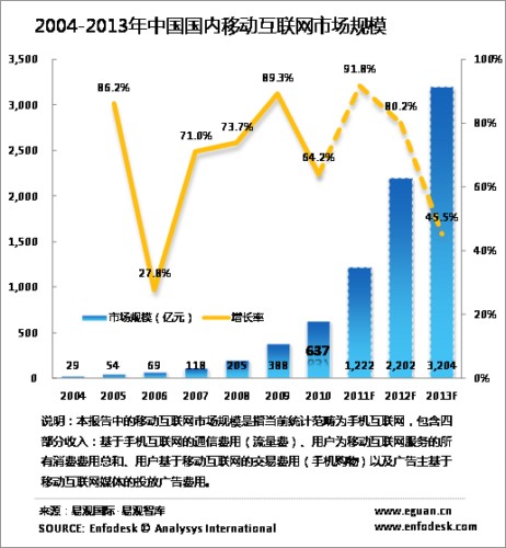 2010年中國國內移動互聯網市場規(guī)模達到637億元,較2009年上漲64.2%,增速放緩。除去流量費之外,移動互聯網服務收入達到342億元。