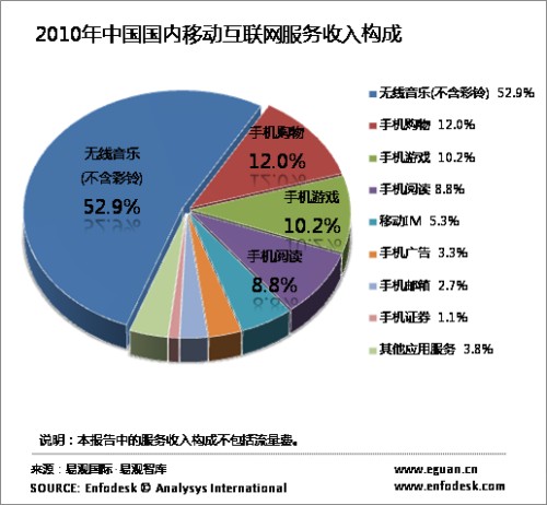 從收入構成看來,無線音樂、手機游戲、手機閱讀逐漸成為三大主要移動互聯網娛樂應用,手機購物增速明顯。