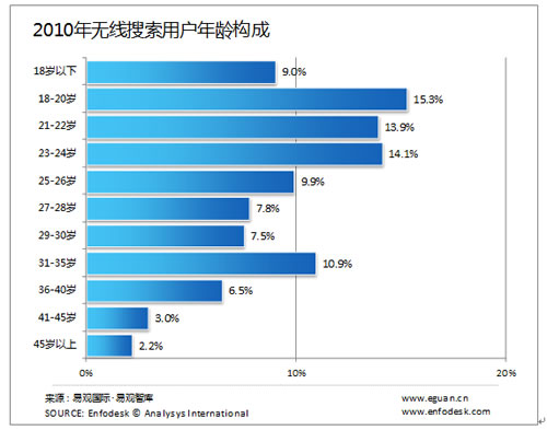據(jù)Enfodesk易觀智庫(kù)近期發(fā)布的研究表明:中國(guó)無(wú)線搜索市場(chǎng)用戶結(jié)構(gòu)在2010年已經(jīng)發(fā)生巨大變化。對(duì)比2009年數(shù)據(jù)來(lái)看,無(wú)線搜素用戶在性別、年齡、職業(yè)分布方面,已經(jīng)發(fā)生快速的變化。