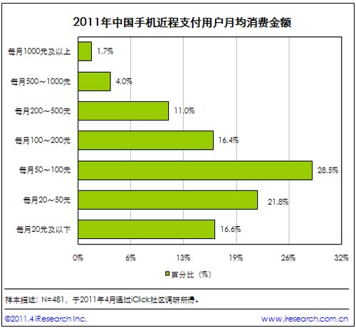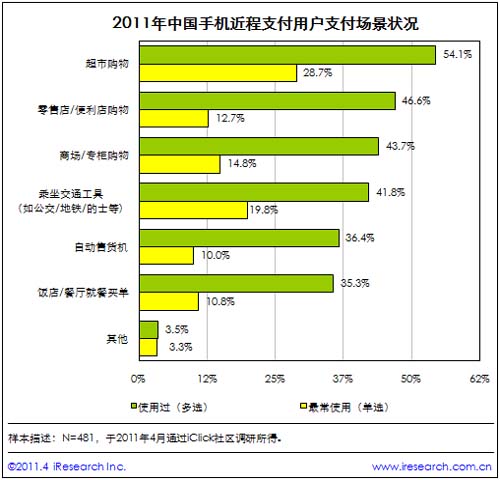 根據(jù)艾瑞咨詢近期發(fā)布的《2011年中國新興線下支付行業(yè)研究報告》的研究數(shù)據(jù)顯示,中國手機支付發(fā)生的場景主要集中在超市、便利店和商場等場所;并且,目前的中國用戶的手機支付金額,都以100元及以下的小額支付為主。