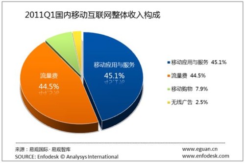 從2011年第1季度移動(dòng)互聯(lián)網(wǎng)收入構(gòu)成,我們發(fā)現(xiàn)移動(dòng)應(yīng)用與服務(wù)仍然是主要營(yíng)收,占總體市場(chǎng)的45.13%。而流量費(fèi)依然占據(jù)44.45%的份額。而移動(dòng)購(gòu)物,無線廣告營(yíng)收占比增長(zhǎng)有限,分別占7.89%和2.52%。