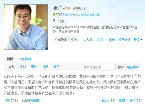 7月12日上午消息,因遭遇存儲(chǔ)故障,從昨日下午2時(shí)起,提供在線(xiàn)服務(wù)的旅游網(wǎng)站藝龍開(kāi)始無(wú)法訪(fǎng)問(wèn),截至目前已經(jīng)過(guò)去了20個(gè)小時(shí)。藝龍CEO崔廣福通過(guò)新浪微博表示,藝龍工程師和EMC存儲(chǔ)工程師正在緊張搶修中,預(yù)計(jì)今天上午能夠恢復(fù)正常。新浪科技