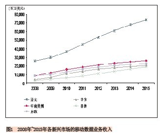就絕對(duì)值來看亞太地區(qū)的新興市場將占主導(dǎo)地位,該地區(qū)的移動(dòng)數(shù)據(jù)業(yè)務(wù)收入將從2010年的368億美元增長到2015年的734億美元,增長率幾乎為100%。給出這么高的預(yù)測值不足為奇,因?yàn)樵撌袌錾嫌兄袊⒂《、印尼“三大巨頭”,這三個(gè)國家對(duì)該區(qū)域數(shù)據(jù)業(yè)務(wù)收入的貢獻(xiàn)將達(dá)到81%。