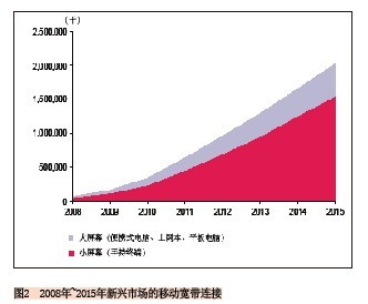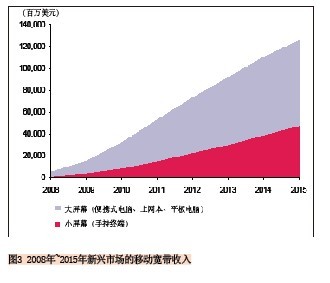 另外一個(gè)預(yù)測也可說明這一趨勢:2010年到2015年小屏幕移動(dòng)寬帶連接的復(fù)合年均增長率為45%,而大屏幕的復(fù)合年均增長率為36%,到2015年新興市場上將有16億的小屏幕連接和近4.59億的大屏幕連接。