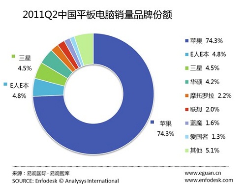 CTI論壇(ctiforum)7月21日消息(記者 楊佳林):根據(jù)易觀智庫最新數(shù)據(jù)顯示,在2011年第2季度蘋果iPad市場(chǎng)銷量份額環(huán)比下滑5.14%,至74.30%。其次是E人E本,占據(jù)了4.82%。三星位列第三。伴隨品牌平板電腦集體上市,以愛國(guó)者、藍(lán)魔為代表的消費(fèi)類電子廠商的平板電腦均收到一定影響,市場(chǎng)銷量和份額均有不同程度下降。