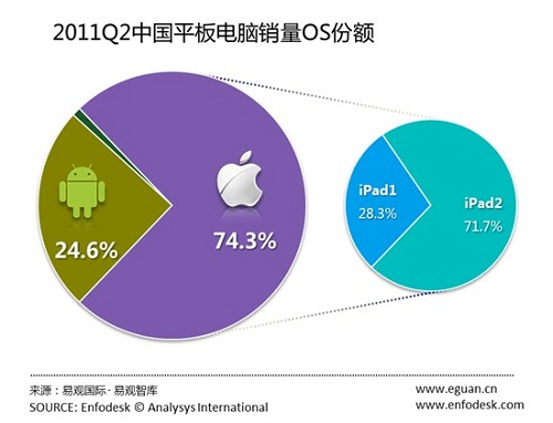 2011年第2季度中國(guó)市場(chǎng)銷售的平板電腦中,iOS系統(tǒng)占比最高,Android系統(tǒng)雖然產(chǎn)品數(shù)量占優(yōu),但占比僅有24.64%。