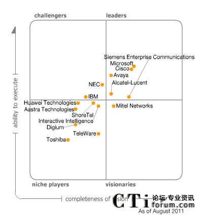 2011年統(tǒng)一通信魔力象限“領(lǐng)導(dǎo)者”象限包括AVAYA公司、阿爾卡特朗訊公司、思科公司、微軟和西門(mén)子企業(yè)通信。微軟是全面的領(lǐng)導(dǎo)者,思科公司與它接近。 NEC公司和IBM公司位于“挑戰(zhàn)者”象限,只有Mitel Networks公司位于“富有遠(yuǎn)見(jiàn)者”象限。七個(gè)其他的公司位于“特定領(lǐng)域者”象限:AASTRA技術(shù)公司、Digium公司、華為技術(shù)公司、Interactive Intelligence公司、ShoreTel公司、TeleWare公司和東芝公司。