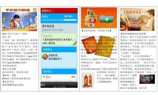 作為快消業(yè)的巨頭,康師傅一直不遺余力地探索新型營(yíng)銷方式,旨在拋棄以往單向、刻板的傳播思路,帶給消費(fèi)者全新的品牌體驗(yàn),“傳世新飲”作為康師傅創(chuàng)新營(yíng)銷方式代表者,定位于中華傳統(tǒng)飲品,希望把中國(guó)傳統(tǒng)飲料發(fā)揚(yáng)光大,所以其理想的消費(fèi)群體是20—29歲地年輕人群,而手機(jī)是這部分人接收信息、互動(dòng)娛樂的重要渠道,開展移動(dòng)營(yíng)銷也是據(jù)此作出的選擇。在與國(guó)內(nèi)領(lǐng)先的全方案移動(dòng)營(yíng)銷服務(wù)提供商百分通聯(lián)的合作中,康師傅一改單純的促銷形式,選擇了近來深受學(xué)生歡迎的手機(jī)位置化簽到和APP互動(dòng)小游戲進(jìn)行整合,并打通了微博、論壇、彩信手機(jī)報(bào)刊廣告、彩信等進(jìn)行立體化傳播,從而發(fā)揮出驚人的傳播能力。