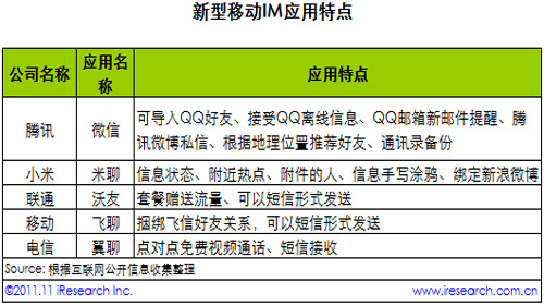 新型移動IM(米聊、微信等)建立在手機通訊錄的基礎上,較以往移動QQ、飛信等具有更強的用戶粘性,并且克服了傳統(tǒng)移動IM需要反復登錄、只能發(fā)送文字、圖片等缺點。