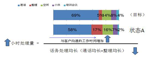 通話狀態(tài)是CSR的重要生產(chǎn)時(shí)間。筆者同過很多CSR交談,發(fā)現(xiàn)他們都有此看法,通話均長適當(dāng)增長通話狀態(tài)就會(huì)提高。但我認(rèn)為這是一個(gè)吃力不討好的方法,影響了個(gè)人的效能與績效收入。對(duì)于CSR個(gè)體,更重要的是提升自己的應(yīng)答能力,適當(dāng)降低自我的通話均長與整理均長。只要做好小休狀態(tài)(CSR主要責(zé)任)、空閑狀態(tài)(排班師、現(xiàn)場(chǎng)主管主要責(zé)任)、整理狀態(tài)(CSR、小組主要責(zé)任),通話狀態(tài)就會(huì)自然增加。